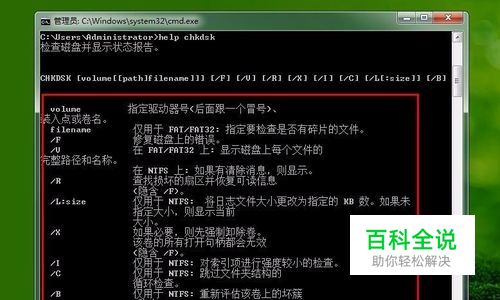 在命令输入好之后同样按回车键enter,下面就会显示chkdsk的一些指令参数,每个指令后边都有介绍说明,我们使用的时候就把上边的 /f换成对应的指令就可以了,如图: