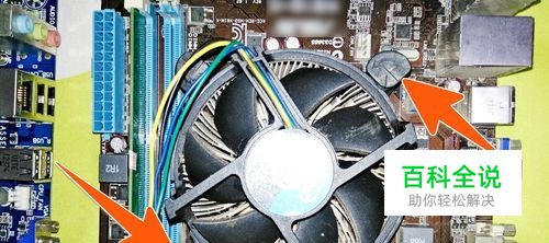 电脑主板上的CPU都是压在机箱里那个大大的风扇下面的,所以要从主板上拆下CPU,那就先得把这个风扇先取下,这个风扇的拆取方式是拧动下图箭头指的这种固定卡梢。