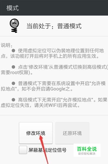 如果手机ROOT了,就可以使用高级模式,点击底部中间的扳手图标,进入「模式」页面,点击「修改环境」按钮。