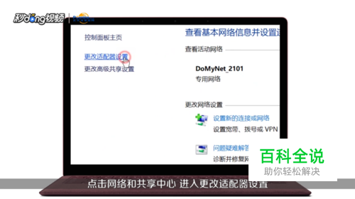 点击进入网络和共享中心,再点击更改适配器选项。