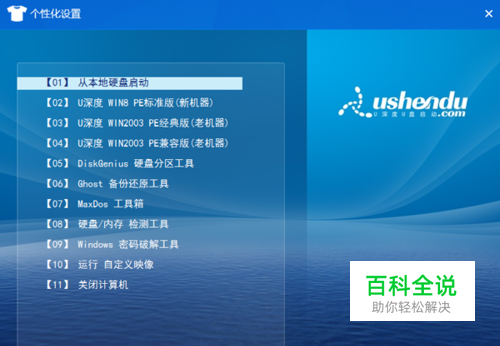 默认启动项是指进入u深度菜单界面时,菜单默认选择的菜单启动项选择位置。例如:这里将默认启动项设置为“11”,之后保存,进入u深度菜单界面上,选择标记会自动停留在“关闭计算机”的菜单启动项。如图所示: