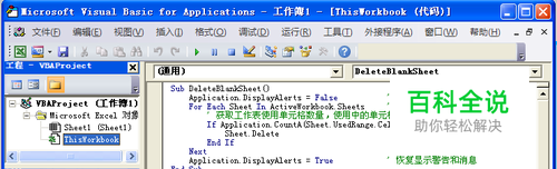 在工程列表中选择:VBAProject(工作簿1)->Microsoft Excel 对象->ThisWorkbook并双击,然后如入如下代码,绿色文字(单引号及其后的文字)为注释,是为了让看的人明白在做什么,可不录入。 Sub DeleteBlankSheet() Application.DisplayAlerts = False ' 隐藏警告和消息 For Each Sheet In ActiveWorkbook.Sheets ' 遍历当前工作表 ' 获取工作表使用单元格数量,使用中的单元格数量为0,即为空工作表 If Application.CountA(Sheet.UsedRange.Cells) = 0 Then Sheet.Delete End If Next Application.DisplayAlerts = True ' 恢复显示警告和消息 End Sub