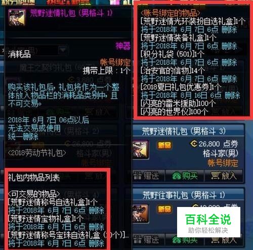 以26800礼包为例给大家详细介绍下礼包内容,物品主要分为三类,不可交易类、可交易类和账号绑定类。