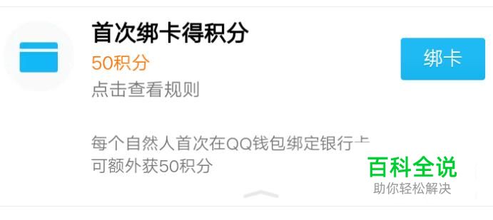 然后,我们在使用QQ钱包的时候如果我们首次绑定银行卡,也可以获得50积分。