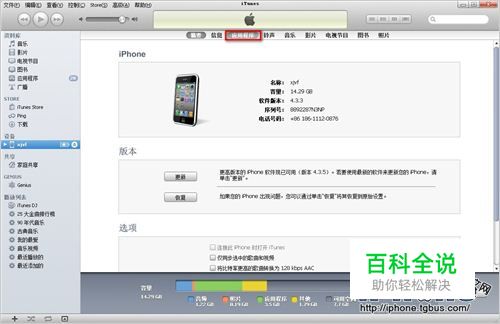打开iTunes后,点击左侧设备图标(红色矩形框标明的位置)。