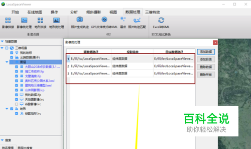 打开LocaSpaceViewer,在“数据处理”菜单中,点击“影像批处理”。 弹出对话框,点击添加数据或添加目录,可以添加单个的影像数据或整个文件夹的多个影像数据,这里我们选择单个添加数据,将需要转换的tif格式的影像数据添加进来,LocaSpaceViewer可以做到一次性转换多个文件,如果转换单个数据就直接添加单个的数据进行转换即可。 可点击删除数据或删除所有,可以选择对话框中已添加的数据或全部数据进行删除。