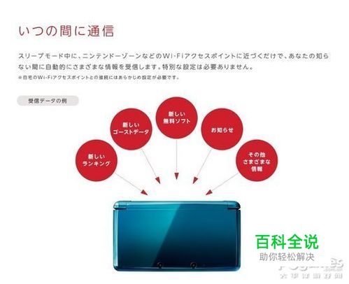 随时随地的通信 3DS设置为“自由模式”的情况下,会自己进行无线LAN的搜索,从网络上搜索情报,游戏数据以及免费软件等。