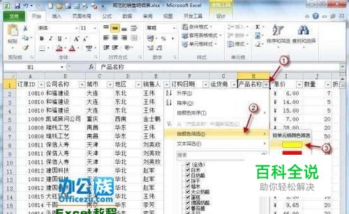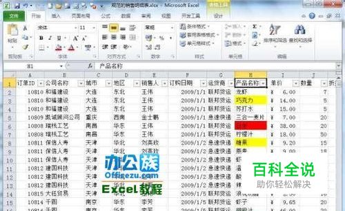 单击“产品名称”列上的筛选按钮,选择“按颜色筛选”,并挑选颜色,例如“黄色”。