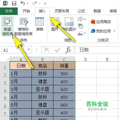 把表格全选中,再点开插入选项卡,在展开的内容中再点:数据透视表