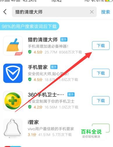 进入之后,搜索“猎豹清理大师”,将其下载安装,如图所示。
