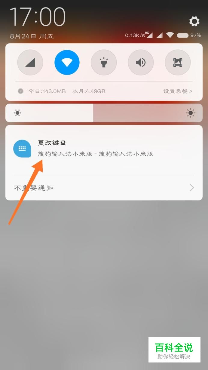 在输入键盘存在的情况之下下拉状态栏,点击“更改键盘”。