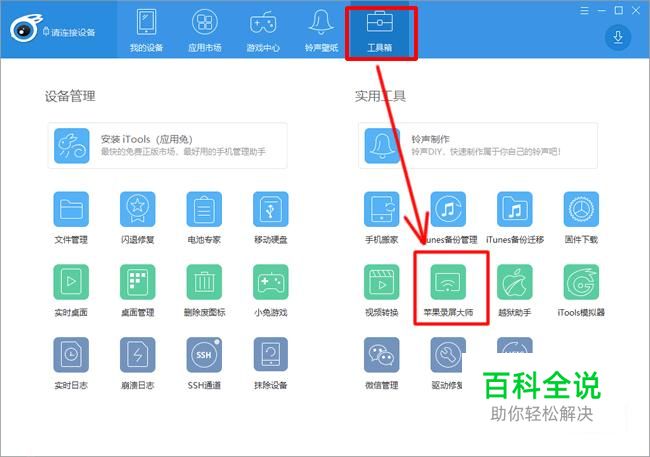 首先在电脑上安装上iTools软件,并点击“工具箱”,“苹果录屏大师”。