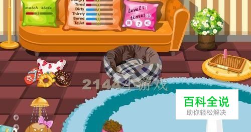 点击物品让小狗吃饭、喝水、洗澡等等。