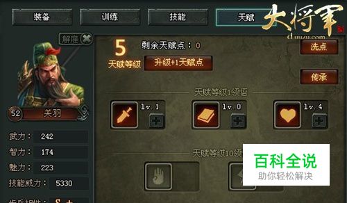 1. 点击“升级+1天赋点”可以消耗银币获得天赋点,单个武将最高可拥有60天赋点。 通过天赋加点,可获得不同的天赋效果。 每种天赋最多提升10层 2. 可通过“洗点”重新分配所有的天赋点数,每次洗点花费50黄金。洗点不会改变天赋等级。“传承”可以将高点数天赋传承给低等级天赋的武将,且不可逆。原有武将天赋点数清零,可从新分配。