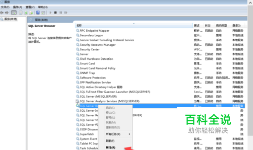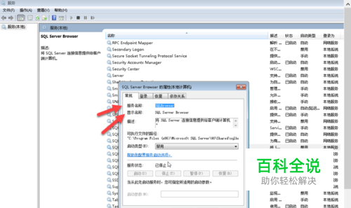 确定"服务名称","服务名称"并不是我们在服务列表里直接看到的名称,我们看到的是服务的"显示名称",查看服务名称的方法,就是在要删除的服务上右击,选择"属性",这时就能看到真正的"服务名称"。比如下面的例子我们要删除“SQL Server Browser”服务,其真实的服务名称为“SQLBrowser”
