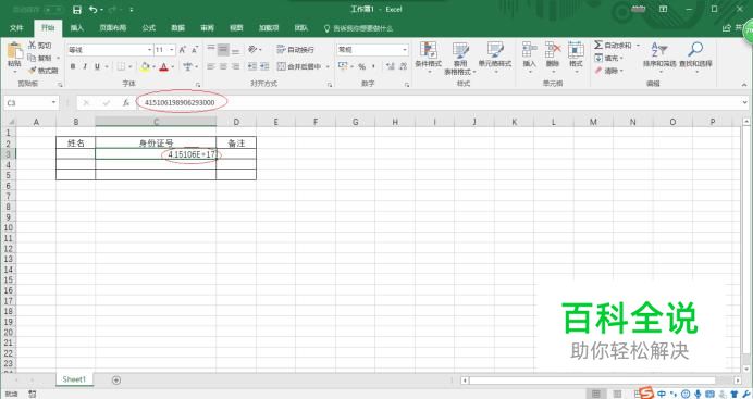 单元格输入员工身份证号"415106198906293067",如图显示"4.15106E+17"。而编辑栏显示最后3位数变成0,这些显然不符合格式要求。