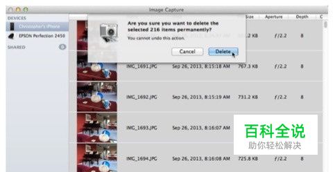 接下来,按住 Command +A,选择 iPhone 内的所有照片点击删除,然后系统会确认是否删除,点击确认,照片就一次性全部删除了