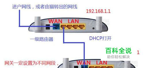 组网方式二:一级宽带路由器LAN口连接二级宽带路由器WAN口: 设置二级路由器的网关和一级路由器的网关在不同网段(如:一级路由器的网关为192.168.1.1,可以设置二级路由器的网关为:192.168.0.1),两个路由器的SSID(名称)设置不同,二级路由器的DHCP功能打开。此时为两个局域网,这时花粉们就可以连接上二级路由器上网了。