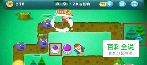 保卫萝卜丛林7关第五个步骤,2个顶级火箭成为了最主要的火力,但是因为攻击间隔比较慢,所以玩家需要利用打怪之余消灭了绿色方框中的障碍物,保卫萝卜丛林7关第六个步骤,把绿色方框中的瓶子和便便炮塔卖掉,然后消灭第8波怪,最后摧毁绿色方框中的障碍物。