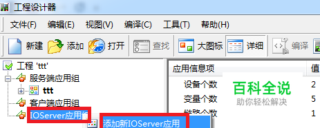 新建工程并打开工程,右击“IOServer应用组”,选择“添加新IOServer应用组”。