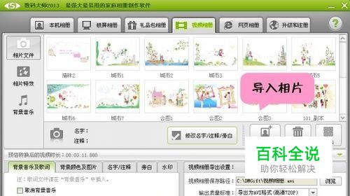 将相片悉数导入软件中,利用文字特效,抒发你的情感 首先,点击“视频相册”选项卡,切换到该面板,点击“添加相片”按钮,将相片悉数导入软件,点击“修改名字/注释/旁白”按钮,发挥你的文采,为相片添加详细的文字说明的。