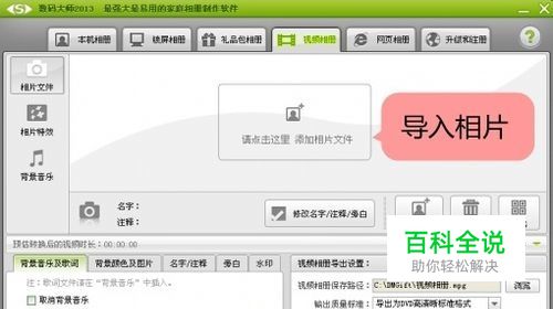 将毕业照、大学拍摄的纪念照片等添加进软件 我们先点击软件主界面顶部的“视频相册”,切换到该面板。按照下图的指引,点击“相片文件”选项卡中部的大按钮,将大学的照片一次性导入。