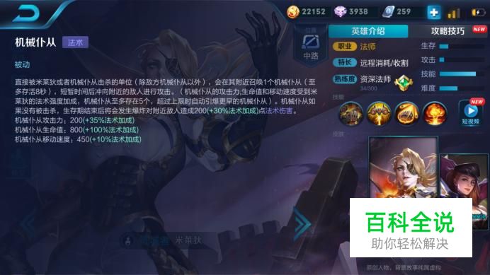 被动:机械仆从。米莱狄直接击杀的敌方生物死后会召唤出机械仆从对敌人造成伤害,机械仆从的速度,伤害和血量都随法强增加。
