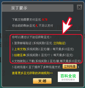 之后,页面会根据您的账户情况,弹出两种不同的提示对话框: A、如果您的账户余额不能满足文档的下载要求,您可以根据提示操作,来获取奖励豆元。然后再重新打开文档进行下载。 B 、如果您的账户余额满足文档的下载要求,则弹出下面的提示框,您可以直接点击“确定”按钮。