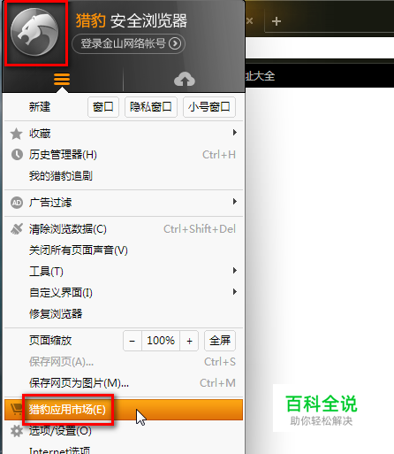 1.打开猎豹浏览器,点左上角按钮→猎豹应用市场。