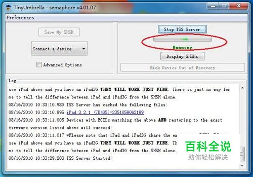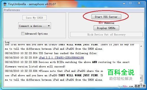 用USB线连接电脑和iPad,现在运行上一步下载的软件,点击图中“Start TSS Server”按钮。