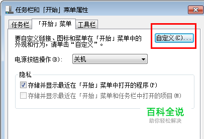 在打开的任务栏和开始菜单属性界面中,切换到“开始菜单”选项卡下,然后点击“自定义”按钮;