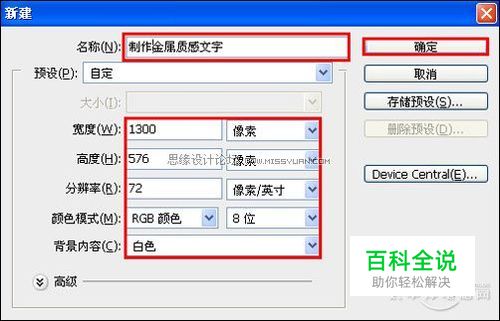 1、打开Photoshop CS4软件,执行菜单:“文件”/“新建”(快捷键Ctrl+N),弹出的新建对话框,名称:制作金属质感文字效果,宽度:1300像素,高度:576像素,分辨率:72像素/英寸,颜色模式:RGB颜色、8位,背景内容:白色,设置完毕后单击确定按钮,如图1所示。