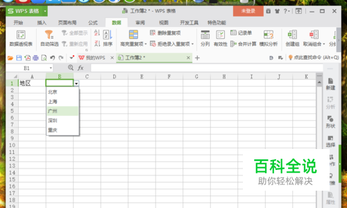 2、在打开的Wps表格程序窗口,在A1单元格中输入“地区”,并选中A2单元格。打开“数据”菜单选项卡,并点击“有效性”选项。如图所示;