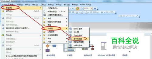 步骤1、点击Microsoft Office Visio 2007打开visio软件,在顶端菜单栏点击“文件->新建->流程图->基本流程图”;