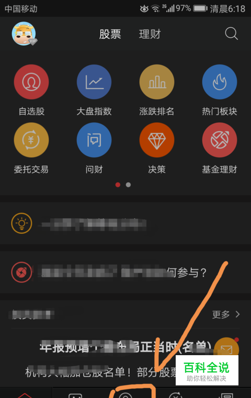 进入股票界面后首先显示的是分时图,点按界面下方箭头指向的三点标志。