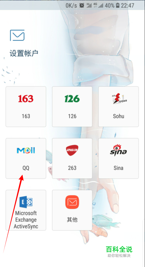 首先打开电子邮件应用,并选择账户登陆方式为QQ。