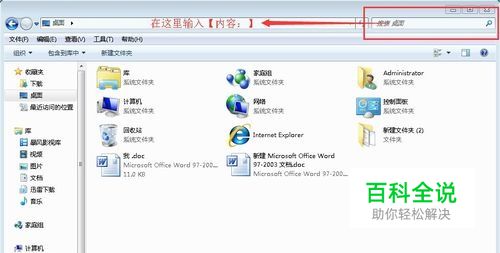 如图所示,直接在搜索的位置输入【内容:】加上你要搜索的文件内容的关键字。PS:1.输入【内容】后一定要加上冒号,不然就会搜索包括【内容】的文件名称;2.本例中是在【桌面】的页面中搜索,搜索的就是【桌面】文件里的内容,如果要搜索某个文件夹中的文档内容,就打开相应的文件夹页面,然后也是在此处输入即可。