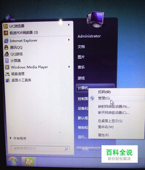 以win7为例,点击左下角的开始, 右键单击“计算机”选项,选择“管理”。