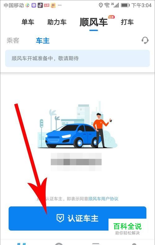 哈啰出行app会默认打开顺风车车主认证界面,点击“认证车主”