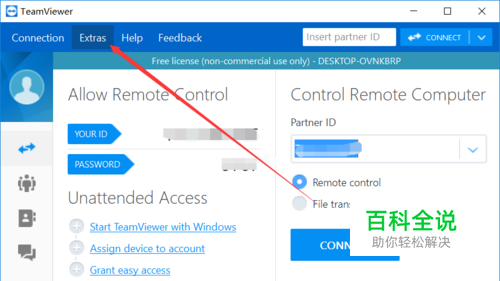 打开TeamViewer软件后可以看到TeamViewer现在显示的是英文,要设置中文就直接点击导航栏里的【Extras】,如下图所示。