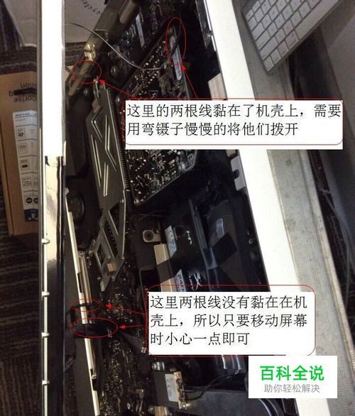 屏幕螺丝拧开后,轻轻的将内屏幕往外拉,屏幕与主板之间有四根线,所以要小心一点,往外拉时要兼顾四根线,同时要保证有足够的空间拆卸下一步会提到的无线网卡和硬盘的螺丝。 (网上有些朋友说可以将盖子拿开,但是我试了拔开一根信号线,拔不下来,对于我们非专业人士来说,还是稳妥点,不要冒这个险了!)
