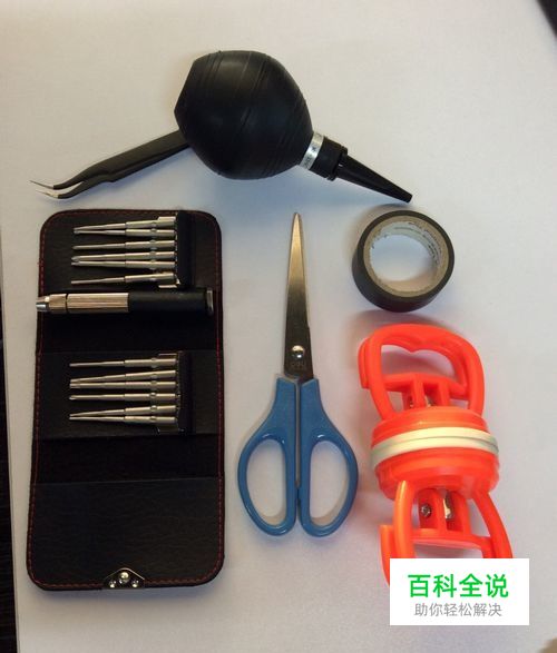 首先,准备好必要的工具,如图 a) 吸盘用来吸开imac的保护屏幕 b) 剪子和绝缘胶布用来固定即将换上去的固态硬盘 c) 吹气清洁球用来清除灰尘 d) 弯镊子可以让某些粘着的信号线松开 e) 套装的各种螺丝刀,在网上买的,有五角六角的,拆卸螺丝时都会用得到
