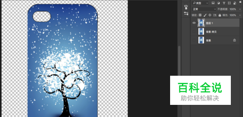 最重要的一步来了,按住ALT键,将鼠标的光标移到首位的图案图层和第二位的手机壳图层中间,当出现一个向下的箭头和一个正方形小方框时,单击鼠标左键。此时,效果就出来了,图案被直接嵌入了手机壳的形状中。