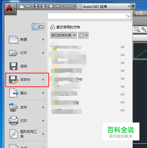再次点击左上角CAD图版,在弹出的菜单中点击“另存为”。