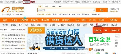 打开阿里巴巴中国站首页,点击如下图所示处的“免费注册”;