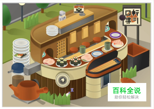 点击获取回转台上的牌子。有一个牌子在放筷子那里,还有一个牌子在边上高高叠起的盘子上。将牌子替换掉厨师边上的牌子,他就会给你相应的寿司。同样参照原图,将寿司放在相应的位置。