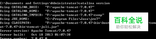 打开cmd,把version.bat拖入到cmd中,点击执行,就可以看到当前,你的tomcat的版本号和一些相关的信息了。
