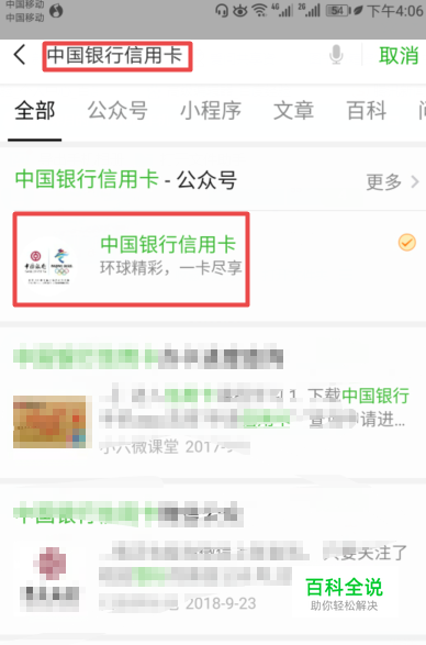 然后我们输入中国银行信用卡进行搜索,弹出的界面,我们点击中国银行信用卡公众号;