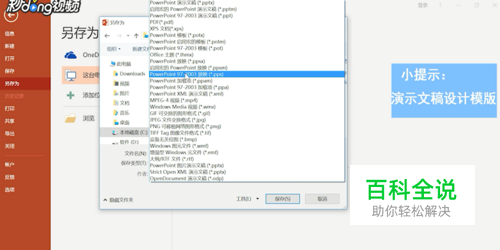 在保存文件对话框下边,文件类型栏里点“下拉箭头”,改成演示文稿设计模板类型。