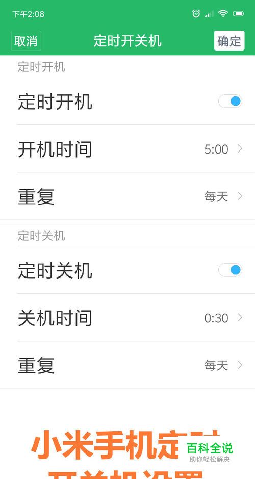 先把定时开机和定时关机的滑块都打开,再把重复定时开关机的的方式选择好,接着把定时开关机的时间各调好,然后点击确定,这样小米6手机的定时自动开关机就设置好了。